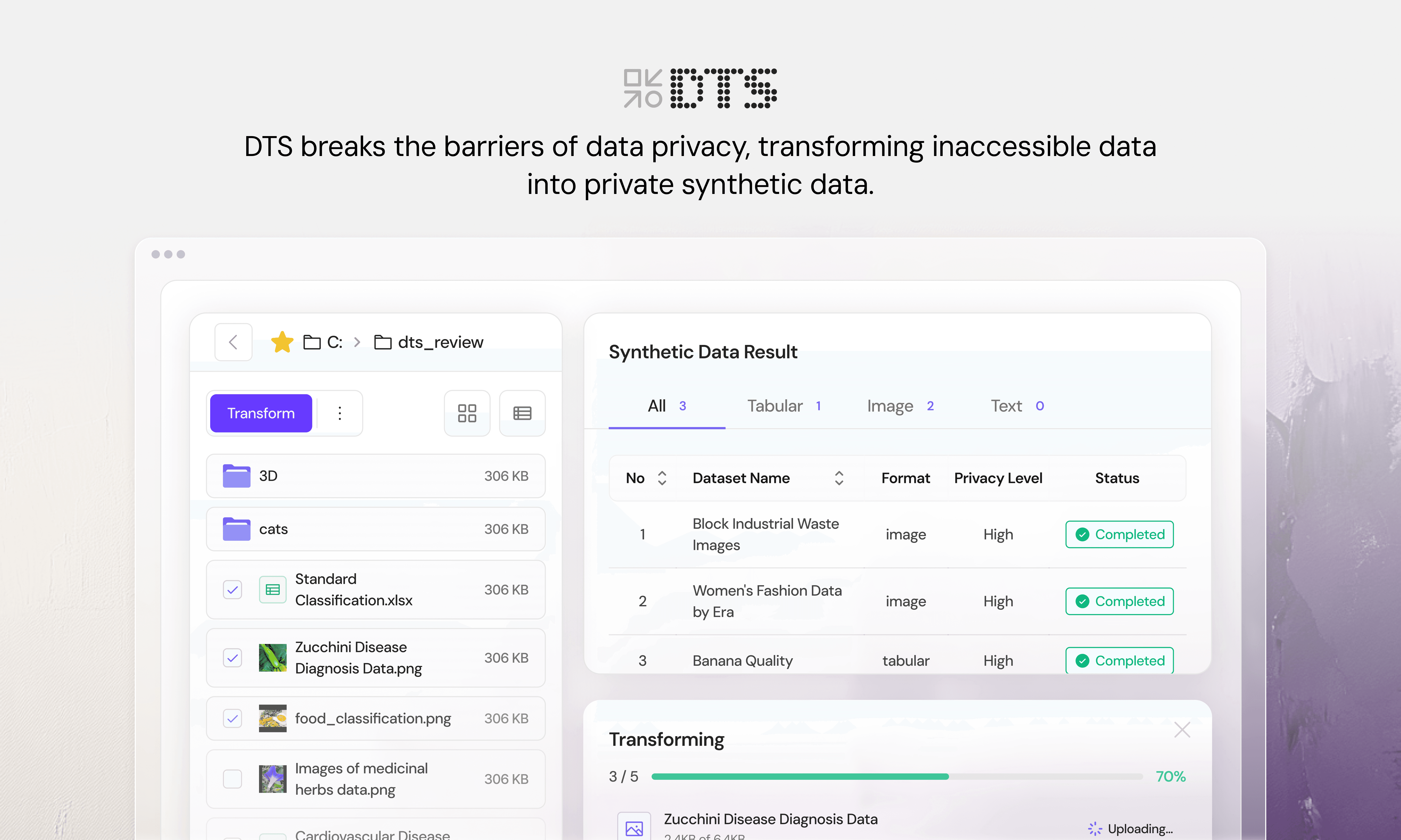 Differential Privacy is applied to mathematically control re-identification risks. With support for tabular, text, image, and time-series formats through a unified pipeline, DTS is optimized for the diverse nature of public-sector data.